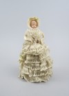 Pagājušā gadsimta 40. – 50. gados darinātā lelle ir roku darbs, kas papildināts ar rūpnieciski ražotu celuloīda lelles galvas sagatavi. Rotaļlietas ķermenis radīts no sablīvēta auduma, apadīta ar baltas vilnas dzijas volāniem, veidojot greznu kleitu, kas asociatīvi atgādina 19. gadsimtam raksturīgu ietērpu. Vienīgi lelles galva – bērna seja – atgādina par 20. gadsimta vidū pieejamajiem materiāliem.