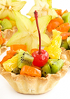 Sastāvdaļas: 1 ābols, 1 bumbieris, 1 greipfrūts, 2 banāni, 2 kivi, 50 g ķirši, 50 g vīnogas, 100 g apelsīnu sula, 2 ēdamkarotes cukura, vafeļu groziņi.